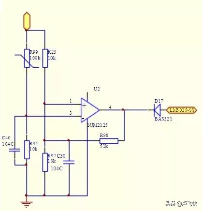 R99熱敏電阻是負(fù)溫度系數(shù)熱敏電阻,常溫時(shí),R99=100k,R99與R94的分壓0.45V為U2運(yùn)放的負(fù)輸入,遠(yuǎn)低于運(yùn)放的正輸入2.5V(R23與R97分壓),因此運(yùn)放的輸出是高電平,對(duì)LM5025的SS端無影響,模塊正常工作。