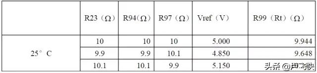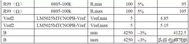 運(yùn)放輸出低后,電阻R98(51k)就并在R97上,將基準(zhǔn)拉低,新的基準(zhǔn)電壓Vref1=Vref*(R98//R97)/(R23+R98//R97)=2.28V達(dá)到2.44V時(shí),R99的阻值R99=Vref*R94/Vref1-R94=11.9kR99達(dá)到10.49k時(shí),溫度按下表計(jì)算