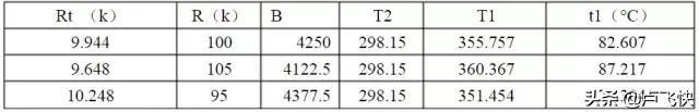 T2:常溫25°C,上式中T2=273.15+25=298.15;B:4250±3%;R:25°C時(shí)的電阻值,100k,計(jì)算出的T1值也是加了273.15后的值,因此下表中t1=T1-273.15,是攝氏度。Rt:溫度變化后的阻值,10k,9.704k,10.304k,見上表