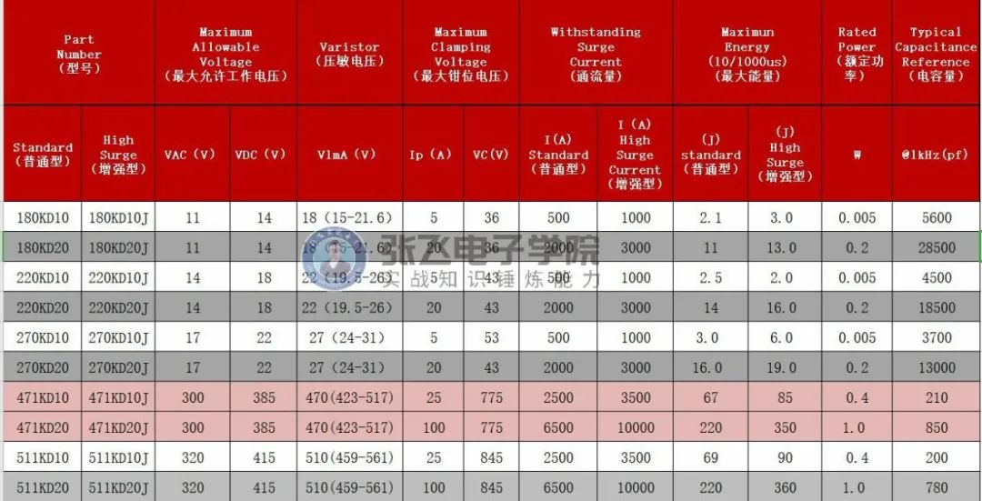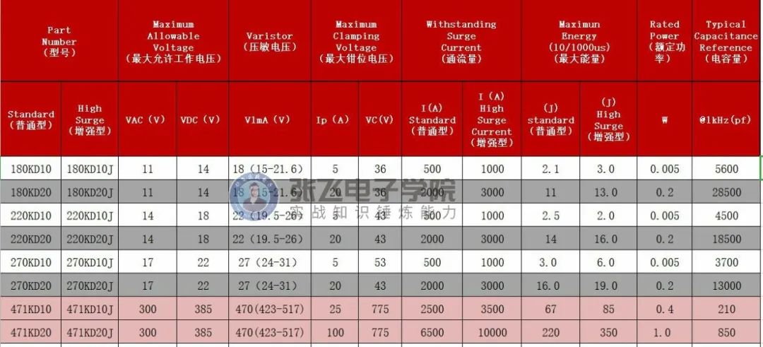 列如我們常用的471 它的大允許電壓AC300V DC385V同時(shí)通流量也是需要注意的,一般規(guī)格書(shū)上給出來(lái)的通流是1次的通流量,我們?cè)谶x取的時(shí)候一定需要留有很大的余量,通流量是我們選擇直徑的依據(jù),如果一個(gè)417KD10 的壓敏電阻在計(jì)算的時(shí)候剛好接近規(guī)格書(shū)上的通流量2500A,我們可以選取兩個(gè)來(lái)并,如果空間不夠的時(shí)候我們可以選擇加強(qiáng)型的。