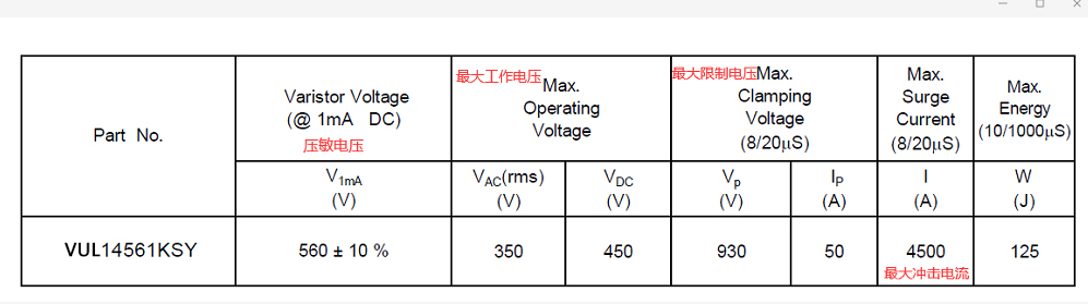 2. 關(guān)于壓敏選型,例如220V的工作電壓,由于電網(wǎng)有波動因素,我們經(jīng)驗的需要,加上一個安全系數(shù)。公式:220*1.414=311,得出311V的工作電壓,那么選用的壓敏工作電壓就要大于我們得出的電網(wǎng)工作電壓311V。如下圖產(chǎn)品TVR14511KSY的工作電壓VAC是320V,大于電網(wǎng)工作電壓311V,那么我們就可以選用這款壓敏電阻。但是根據(jù)環(huán)境電壓波動,可以選用工作電壓再大一點的壓敏電阻,如下圖產(chǎn)品TVR14561KSY,這樣就會更保險。