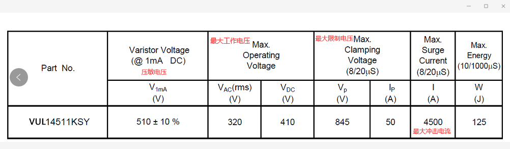 2. 關(guān)于壓敏選型,例如220V的工作電壓,由于電網(wǎng)有波動因素,我們經(jīng)驗的需要,加上一個安全系數(shù)。公式:220*1.414=311,得出311V的工作電壓,那么選用的壓敏工作電壓就要大于我們得出的電網(wǎng)工作電壓311V。如下圖產(chǎn)品TVR14511KSY的工作電壓VAC是320V,大于電網(wǎng)工作電壓311V,那么我們就可以選用這款壓敏電阻。但是根據(jù)環(huán)境電壓波動,可以選用工作電壓再大一點的壓敏電阻,如下圖產(chǎn)品TVR14561KSY,這樣就會更保險。