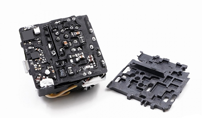大部分充電器插頭的內(nèi)部是全黑氧化物印刷電路板和黑色電子元器件,印刷電路板的后面是塑膠保障框架,作為固定架。充電器插頭頂部的電感,電容和變壓器也裝有相應(yīng)的塑膠骨架實(shí)現(xiàn)固定。在印刷電路板上,是電源主控制集成電路,NTC熱敏電阻和別的電子元器件。