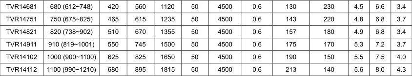 壓敏電阻片徑: Φ14mm 標(biāo)稱(chēng)壓敏電壓(@1mADC): 750V(675~825)