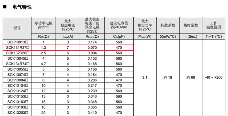 熱敏電阻: VT 熱敏電阻型號(hào): SCK131R37MSY 熱敏電阻片徑: Φ13mm 零功率電阻@25℃: 1.3Ω 工作溫度范圍: -40℃±170℃ 儲(chǔ)存溫度范圍: -40℃±85℃
