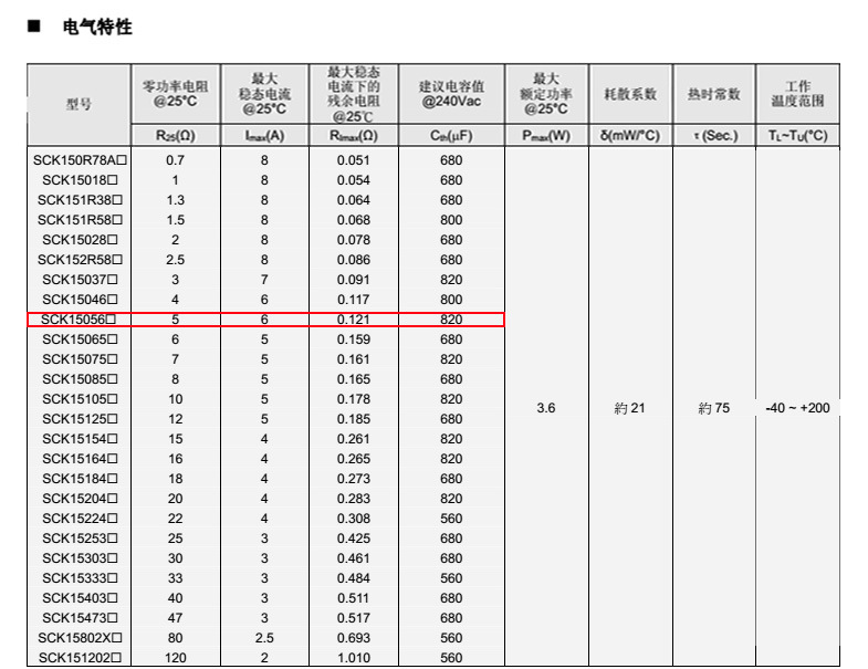 熱敏電阻: VT 熱敏電阻型號: SCK15056MSY 熱敏電阻片徑: Φ15mm 零功率電阻@25℃: 5Ω 工作溫度范圍: -40℃±200℃ 儲存溫度范圍: -40℃±85℃