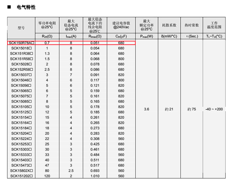 熱敏電阻: 穩(wěn)騰 熱敏電阻型號: SCK150R78AMSY 熱敏電阻片徑: Φ15mm 零功率電阻@25℃: 0.7Ω 工作溫度范圍: -40℃±200℃ 儲存溫度范圍: -40℃±85℃
