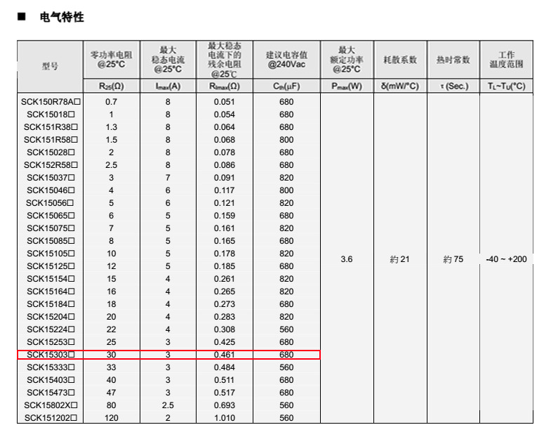 熱敏電阻: 穩(wěn)騰 熱敏電阻型號: SCK15303MSY 熱敏電阻片徑: Φ15mm 零功率電阻@25℃: 30Ω 工作溫度范圍: -40℃±200℃ 儲存溫度范圍: -40℃±85℃
