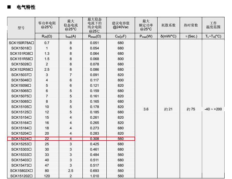 熱敏電阻: 穩(wěn)騰 熱敏電阻型號(hào): SCK15224MSY 熱敏電阻片徑: Φ15mm 零功率電阻@25℃: 22Ω 工作溫度范圍: -40℃±200℃ 儲(chǔ)存溫度范圍: -40℃±85℃