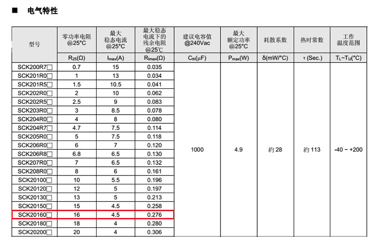 熱敏電阻: VT 熱敏電阻型號(hào): SCK202R5MSY 熱敏電阻片徑: Φ20mm 零功率電阻@25℃: 2.5Ω 工作溫度范圍: -40℃±200℃ 儲(chǔ)存溫度范圍: -40℃±85℃