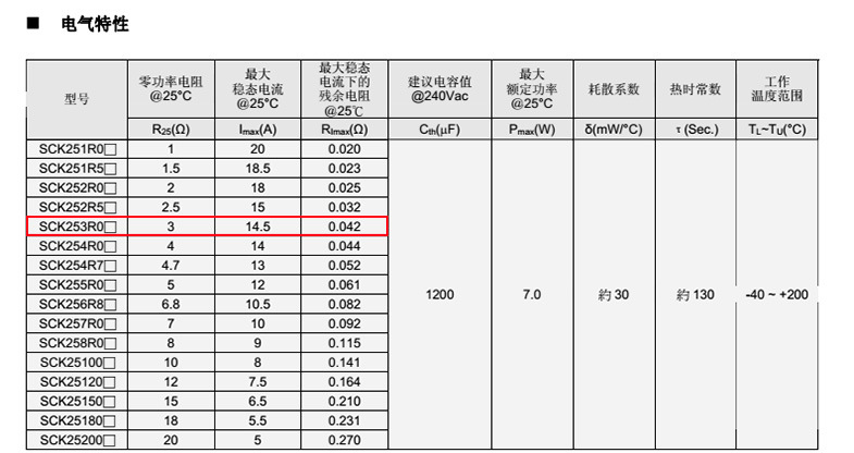 熱敏電阻: VT 熱敏電阻型號(hào): SCK253R0MSY 熱敏電阻片徑: Φ25mm 零功率電阻@25℃: 3Ω 工作溫度范圍: -40℃±200℃ 儲(chǔ)存溫度范圍: -40℃±85℃