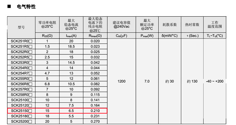 熱敏電阻: VT 熱敏電阻型號(hào): SCK25150MSY 熱敏電阻片徑: Φ20mm 零功率電阻@25℃: 15Ω 工作溫度范圍: -40℃±200℃ 儲(chǔ)存溫度范圍: -40℃±85℃
