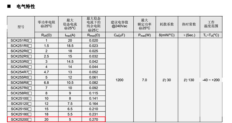 熱敏電阻: VT 熱敏電阻型號(hào): SCK25200MSY 熱敏電阻片徑: Φ25mm 零功率電阻@25℃: 20Ω 工作溫度范圍: -40℃±200℃ 儲(chǔ)存溫度范圍: -40℃±85℃