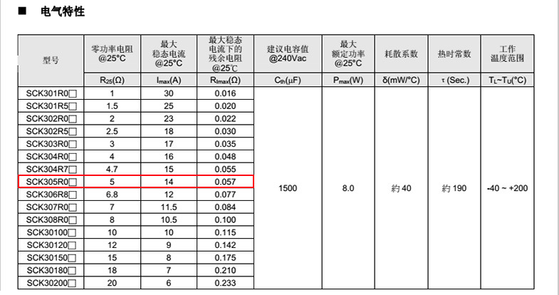 熱敏電阻: VT 熱敏電阻型號: SCK305R0MSY 熱敏電阻片徑: Φ30mm 零功率電阻@25℃: 5Ω 工作溫度范圍: -40℃±200℃ 儲存溫度范圍: -40℃±85℃