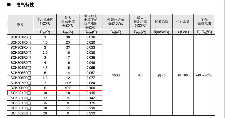 熱敏電阻: VT 熱敏電阻型號(hào): SCK30100MSY 熱敏電阻片徑: Φ30mm 零功率電阻@25℃: 10Ω 工作溫度范圍: -40℃±200℃ 儲(chǔ)存溫度范圍: -40℃±85℃