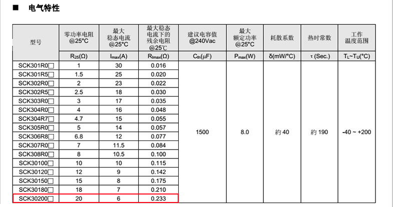 熱敏電阻: VT 熱敏電阻型號: SCK30200MSY 熱敏電阻片徑: Φ30mm 零功率電阻@25℃: 20Ω 工作溫度范圍: -40℃±200℃ 儲存溫度范圍: -40℃±85℃