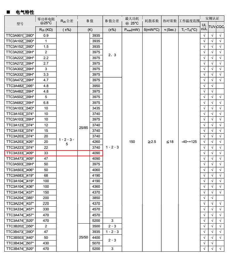 熱敏電阻型號(hào)::TTC3A333F409EY |